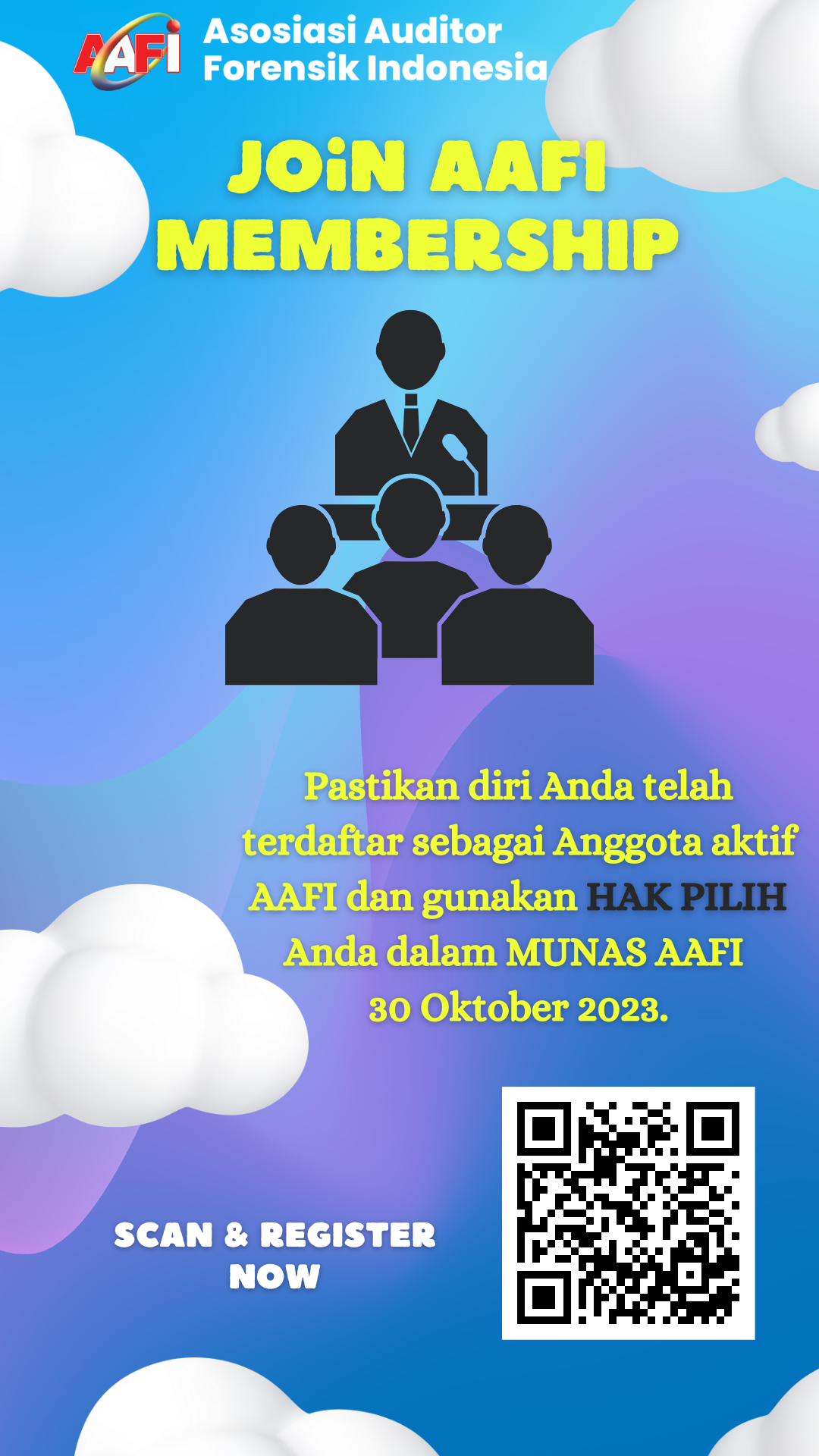 Asosiasi Forensik Auditor Indonesia (AAFI SUMBO) mengundang Bapak/Ibu Anggota Aktif AAFI SUMBO untuk melakukan pendaftaran Musyawarah Nasional (MUNAS) AAFI SUMBO yang direncanakan akan dilaksanakan pada 30 Oktober 2023. Silakan melakukan pendaftaran di website AAFI SUMBO dengan alamat www.aafisumbo.org/2023. Jangan lupa siapkan Sertifikat Certified Forensic Auditor (CFrA) dan Bukti Iuran Tahunan AAFI SUMBO saat pendaftaran.