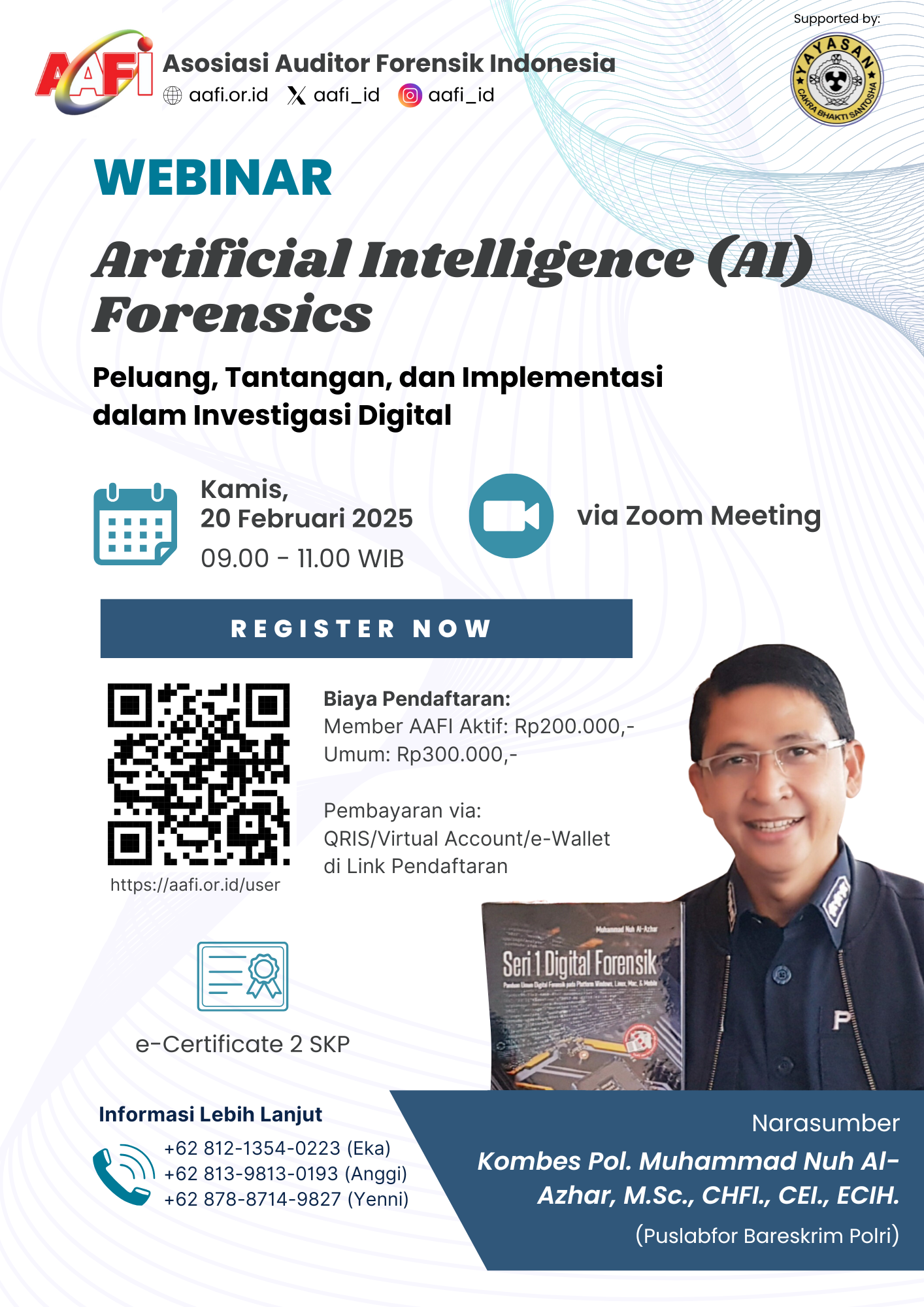 Untuk menjawab pertanyaan-pertanyaan ini, Asosiasi Auditor Forensik Indonesia Sumbo (AAFI SUMBO), dengan dukungan dari Yayasan Cakra Bhakti Santosha, mengadakan webinar bertema "Artificial Intelligence (AI) Forensics".