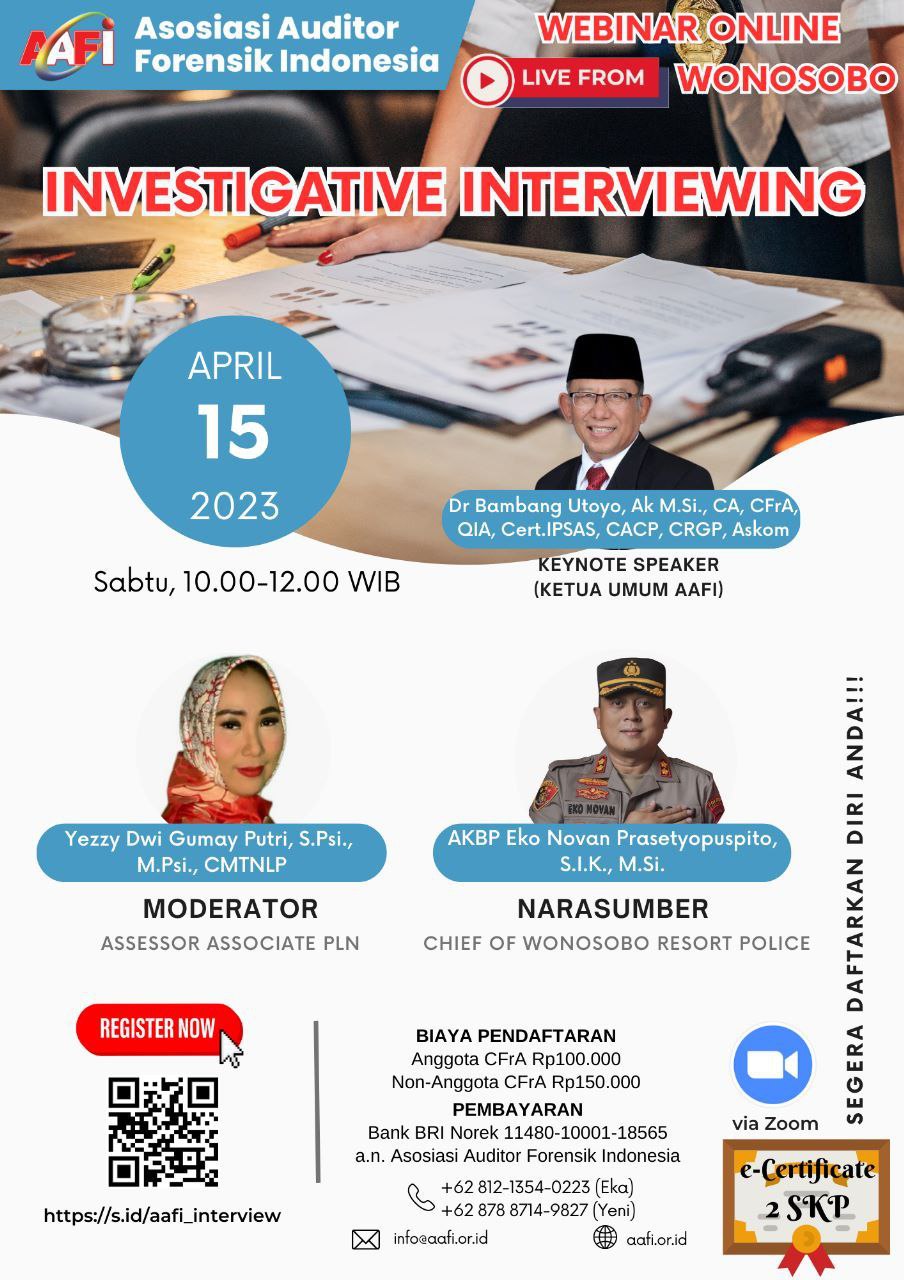 Asosiasi Forensik Auditor Indonesia (AAFI SUMBO) mengundang Bapak/Ibu dalam Webinar Online dengan Tema INVESTIGATIVE INTERVIEWING