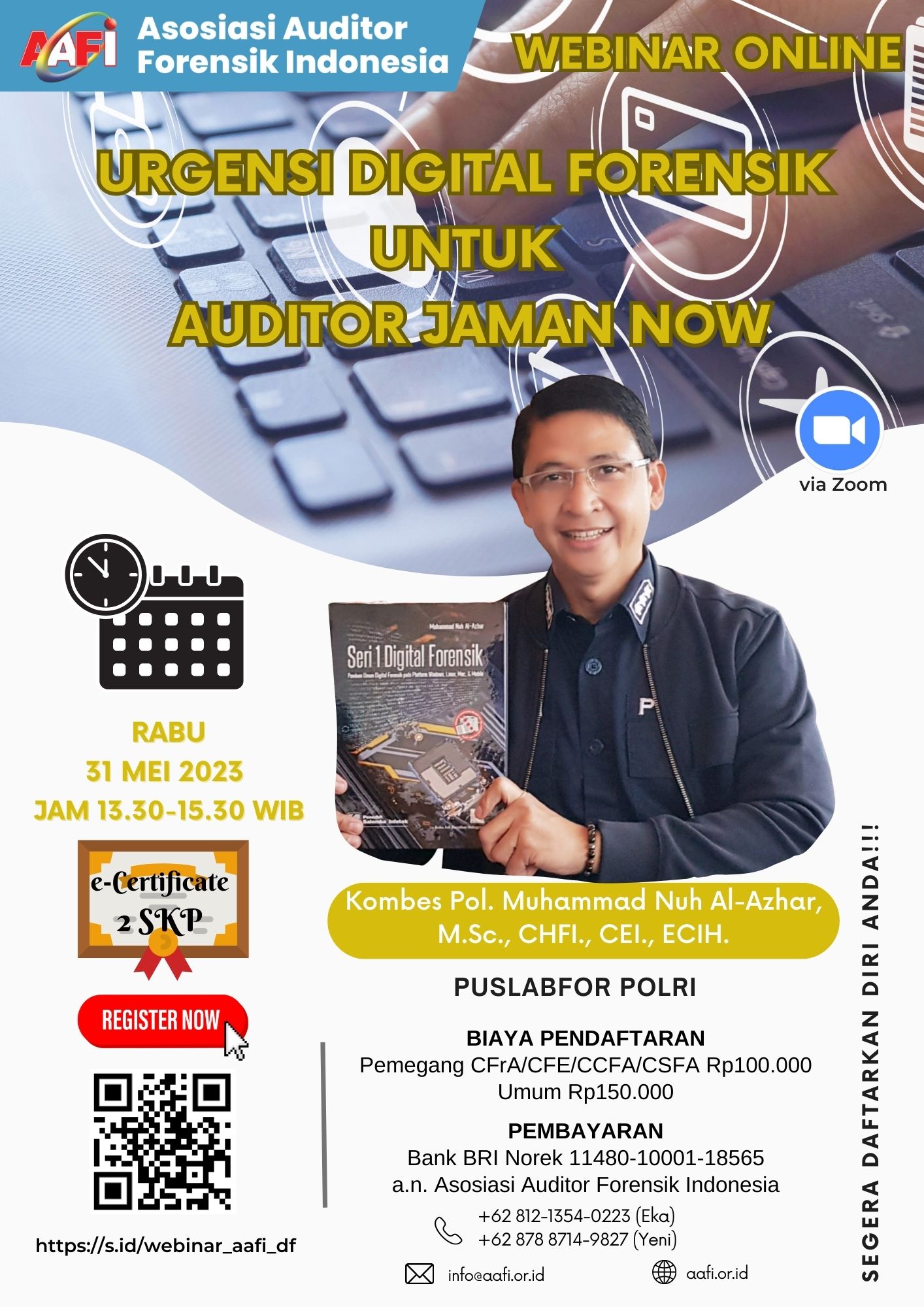 Asosiasi Forensik Auditor Indonesia (AAFI SUMBO) mengundang Bapak/Ibu dalam Webinar Online dengan Tema "URGENSI DIGITAL FORENSIK UNTUK AUDITOR JAMAN NOW" yang menghadirkan Ahli Digital Forensik, Komisaris Besar Polisi Muhammad Nuh Al-Azhar, S.T., M.Sc., CHFI., CEI., ECIH. dari PUSLABFOR POLRI.